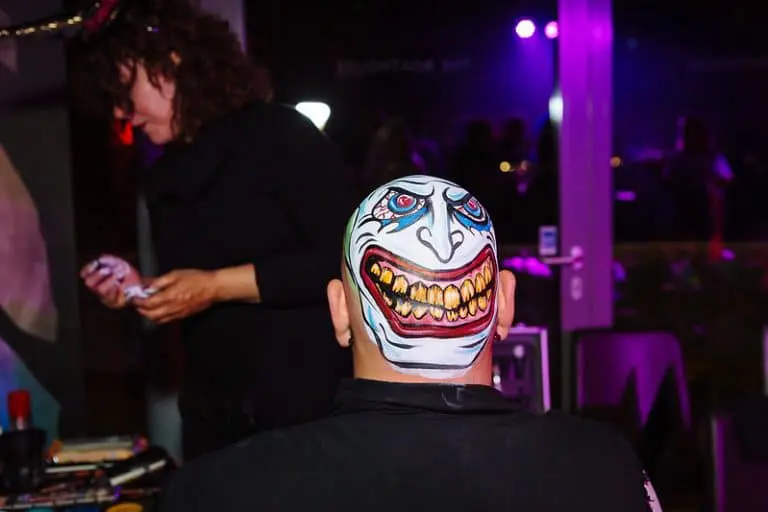 Laat je op het feest schminken door een professional. De leukste manier? Zorgen dat je zo eng mogelijk wordt geschminkt, zodat je jouw collega’s de stuipen op het lijf jaagt!