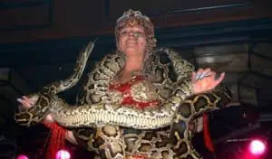 Halverwege komt Corine binnendansen. Met veel vuur danst zij haar ‘Dance of the dessert’. Daar komen ook nog tijgerpythons bij. Boeiende dieren met een magische uitstraling. Durf jij ze aan te raken? Of zelf op je schouder nemen?