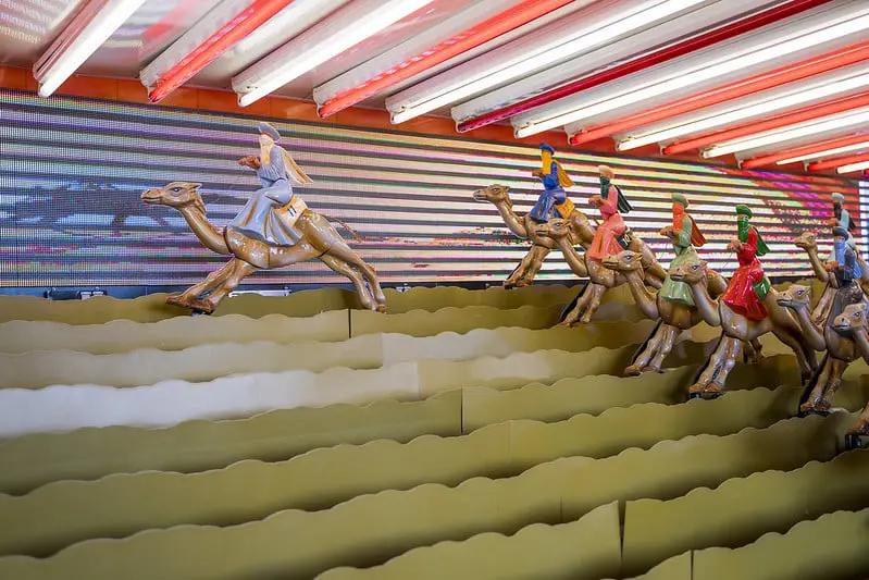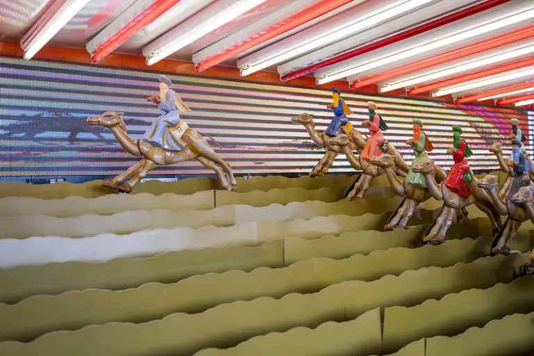 Een kamelenrace is een interactief spel waarbij deelnemers op mechanische kamelen zitten.